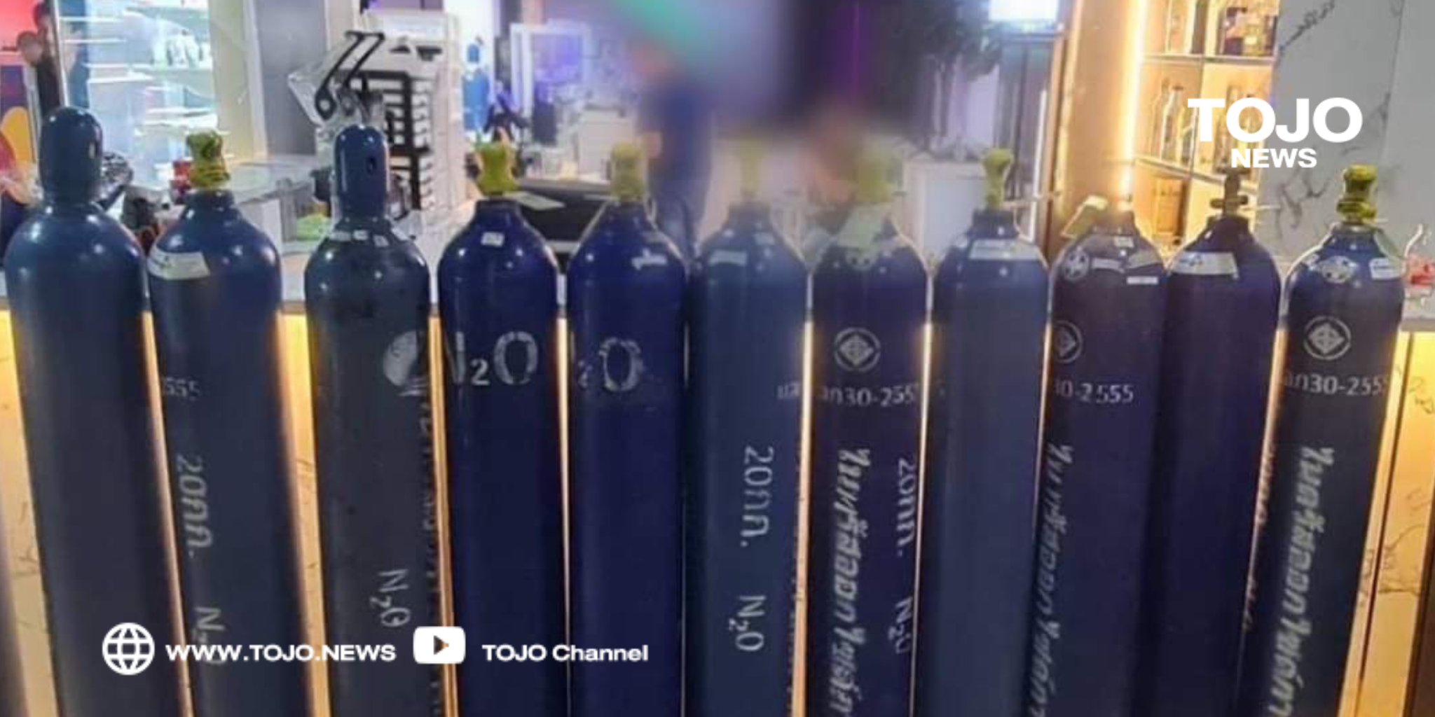 5. ถังแก๊สหัวเราะ (ไนตรัสออกไซด์) สำหรับบรรจุใส่ลูกโป่ง จำนวน 14 ถัง ยึดได้จากห้องเก็บของด้านหลังร้าน