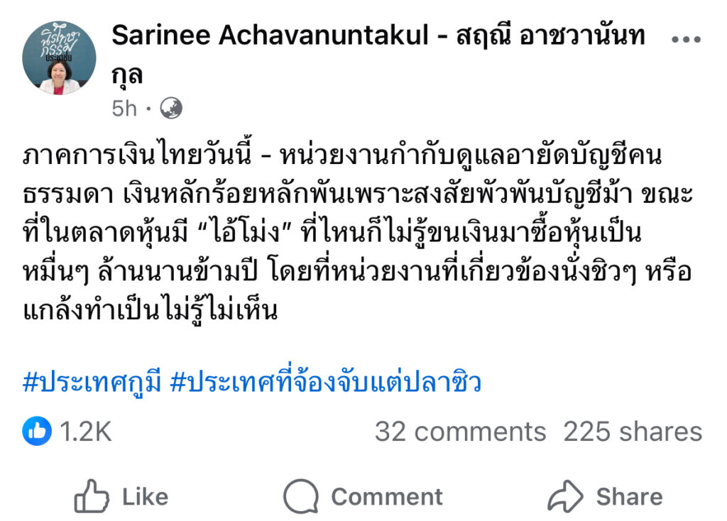 สฤณี ฟาด เจ้าหน้าที่อายัดบัญชีคนธรรมดา แต่ทำเป็นไม่รู้ไม่เห็น ไอ้โม่งขนเงินมาซื้อหุ้นเป็นหมื่นล้าน