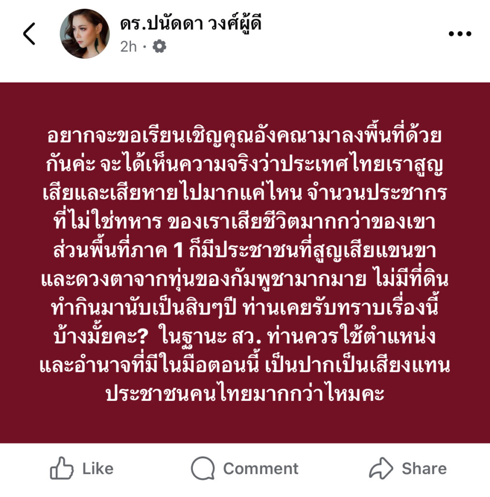 อยากจะขอเรียนเชิญคุณอังคณามาลงพื้นที่ด้วยกันค่ะ จะได้เห็นความจริงว่าประเทศไทยเราสูญเสียและเสียหายไปมากแค่ไหน จำนวนประชากร ที่ไม่ใช่ทหาร ของเราเสียชีวิตมากกว่าของเขา ส่วนพื้นที่ภาค 1 ก็มีประชาชนที่สูญเสียแขนขาและดวงตาจากทุ่นของกัมพูชามากมาย ไม่มีที่ดินทำกินมานับเป็นสิบๆปี ท่านเคยรับทราบเรื่องนี้บ้างมั้ยคะ? ในฐานะ สว. ท่านควรใช้ตำแหน่งและอำนาจที่มีในมือตอนนี้ เป็นปากเป็นเสียงแทนประชาชนคนไทยมากกว่าไหมคะ