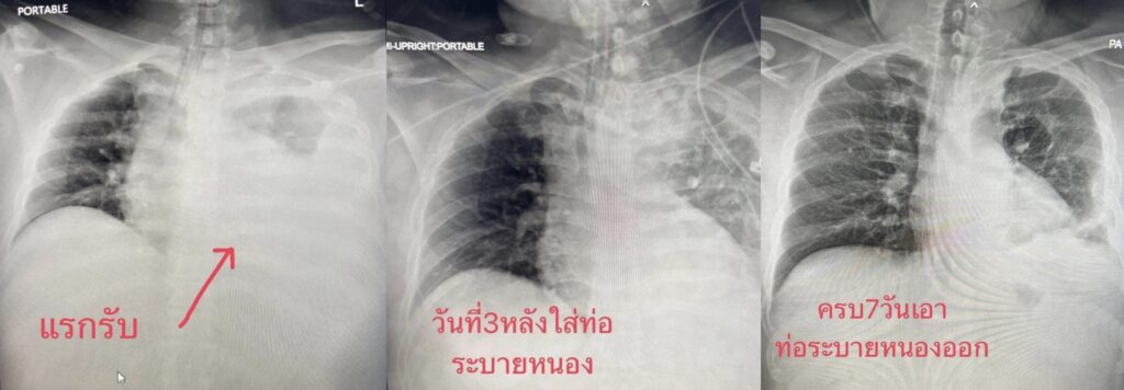 อย่างไรก็ตาม วันที่ 3 หลังใส่ท่อระบายหนอง พบว่าคนไข้ปอดขยายตัวได้ดี อีก 7 วันต่อมาหนองไม่ออกเพิ่ม แพทย์จึงเอาท่อระบายหนองออก ไข้ลดลง สัญญาณชีพปกติ ปอดขยายตัวกลับมาเกือบปกติ ถอดท่อหายใจและเครื่องช่วยหายใจออกได้ โดยผู้ป่วยกลับมาหายใจได้เป็นปกติ