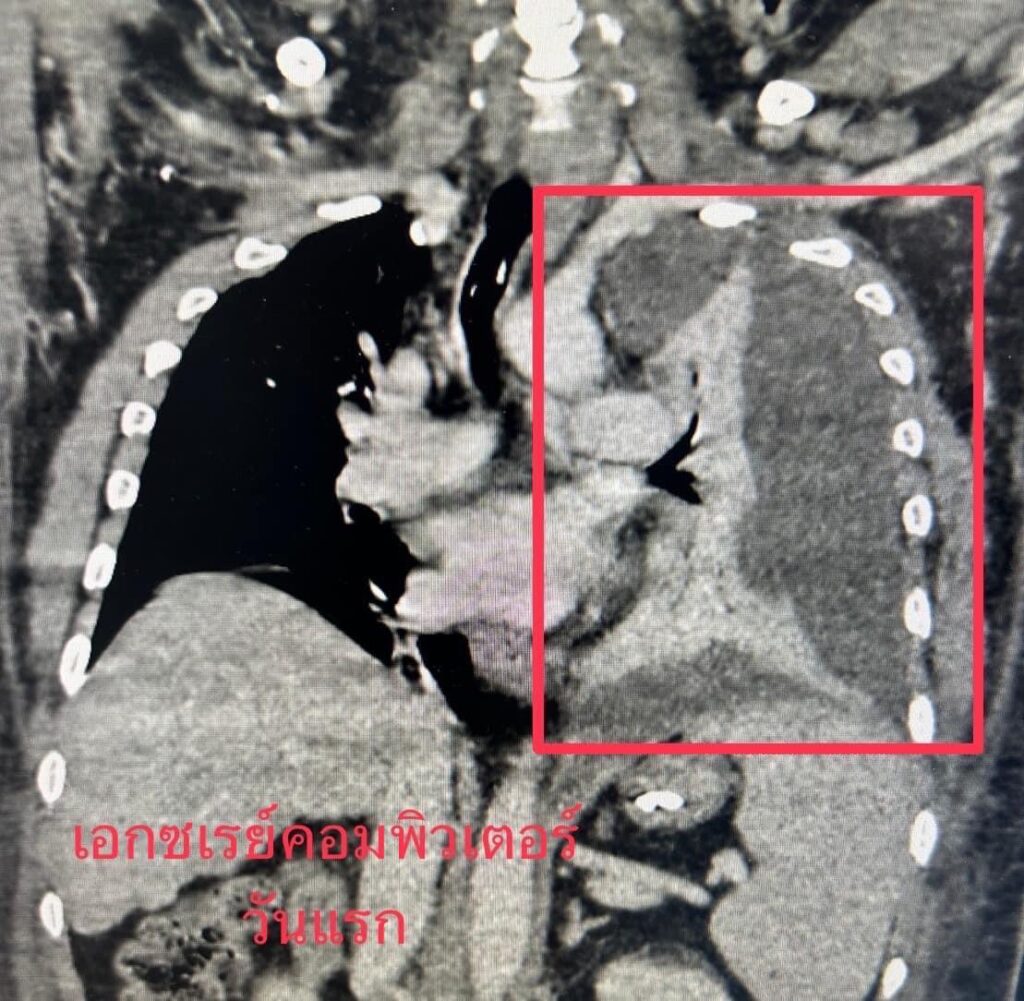 แพทย์ที่รับตัวขณะแรกรับนำผู้ป่วยเข้าเอกซเรย์ปอด ผลเอกซเรย์ปอดซ้ายหายไปเกือบทั้งหมด ผู้ป่วยเริ่มมีความดันต่ำ ชีพจรเบา หัวใจเต้นเร็ว หายใจเร็ว กระสับกระส่าย เริ่มไม่รู้สึกตัว แสดงถึงอาการช็อกจากระบบการหายใจล้มเหลว แพทย์ต้องรีบใส่ท่อหายใจ นำเข้าไอซียู เจาะปอดซ้ายพบว่ามีน้ำหนองสีน้ำตาล มีกลิ่นเหม็น จึงทำการผ่าตัดใส่ท่อระบายหนองเป็นการด่วน สามารถระบายหนองออกมาประมาณ 1,200 cc. ส่งเพาะเชื้อ ระหว่างนั้นแพทย์ให้ยาต้านเชื้อในทันที ที่คาดว่าจะคลุมเชื้อที่พบได้บ่อย