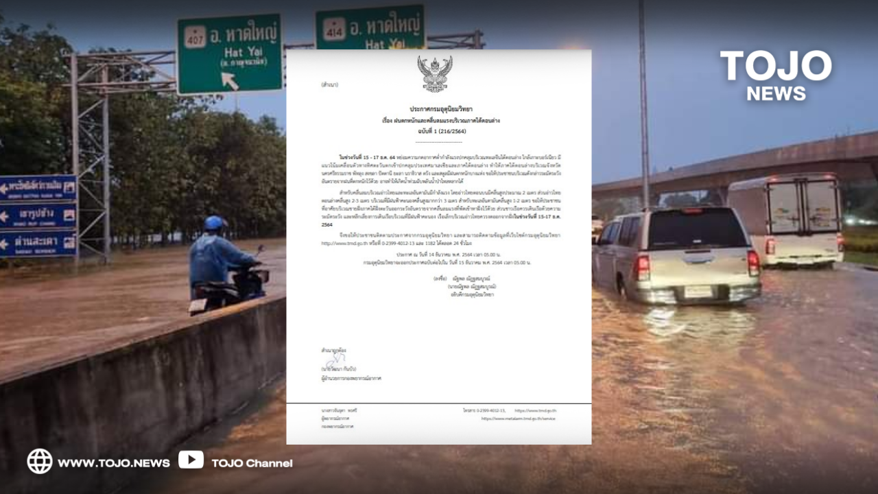 ผู้สื่อข่าวโตโจ้นิวส์รายงานว่า กรมอุตุนิยมวิทยา เปิดเผยว่า ในช่วงวันที่ 15 – 17 ธ.ค. 64 หย่อมความกดอากาศต่ำกำลังแรงปกคลุมบริเวณทะเลจีนใต้ตอนล่าง ใกล้เกาะบอร์เนียว มีแนวโน้มเคลื่อนตัวทางทิศตะวันตกเข้าปกคลุมประเทศมาเลเซียและภาคใต้ตอนล่าง ทำให้ภาคใต้ตอนล่างบริเวณจังหวัดนครศรีธรรมราช พัทลุง สงขลา ปัตตานี ยะลา นราธิวาส ตรัง และสตูลมีฝนตกหนักบางแห่ง ขอให้ประชาชนบริเวณดังกล่าวระมัดระวังอันตรายจากฝนที่ตกหนักไว้ด้วย อาจทำให้เกิดน้ำท่วมฉับพลันน้ำป่าไหลหลากได้