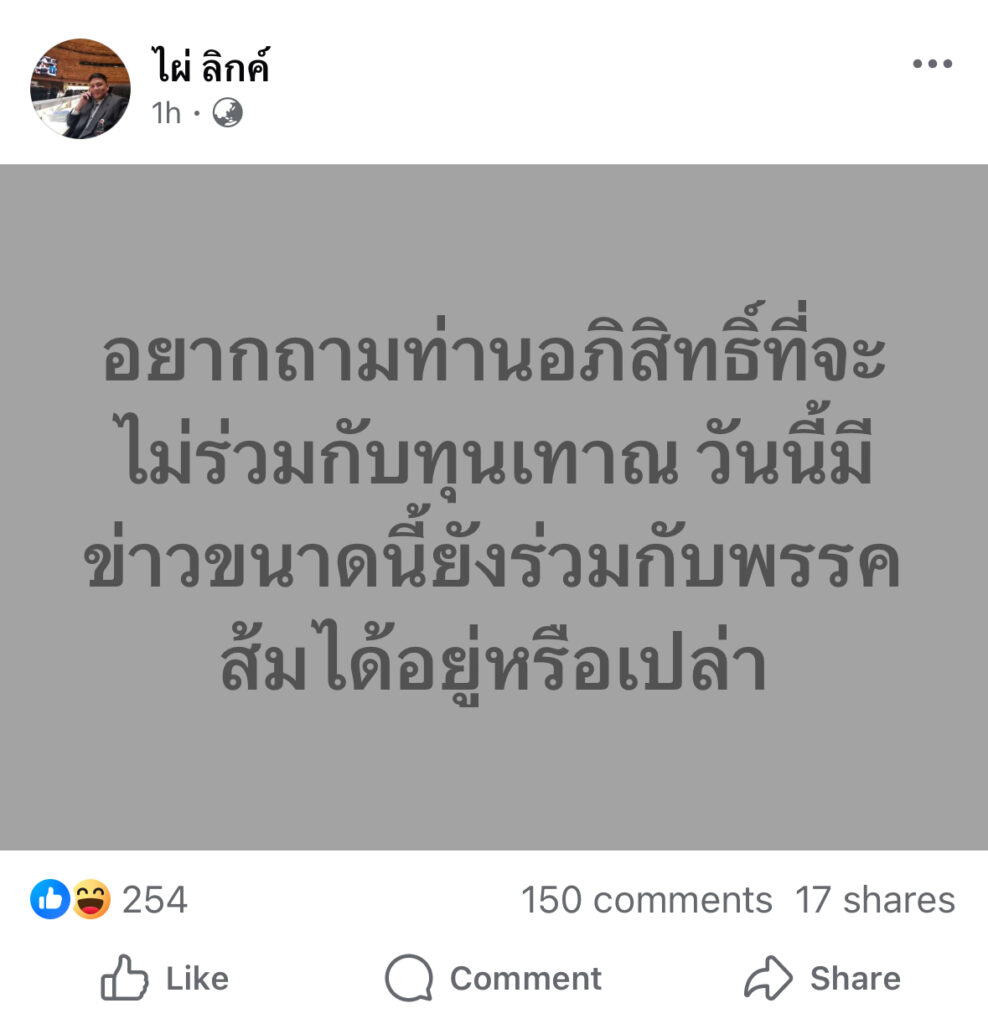 อยากถามท่านอภิสิทธิ์ที่จะไม่ร่วมกับทุนเทาณ วันนี้มีข่าวขนาดนี้ยังร่วมกับพรรคส้มได้อยู่หรือเปล่า