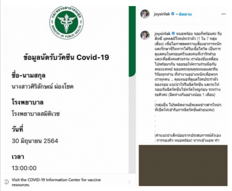 ผู้สื่อข่าวโตโจ้นิวส์รายงานว่า จอย ศิริลักษณ์ ดารานักแสดงชื่อดัง ได้โพสต์ภาพพร้อมข้อความผ่านอินสตาแกรม ระบุว่า “หมอพร้อม จอยก็พร้อมค่ะ รับสิทธิ์ บุคคลมีโรคประจำตัว (1 ใน 7 กลุ่มเสี่ยง) เพื่อโอกาสลดความเสี่ยงอาการหนักและรักษาชีวิตหากได้รับเชื้อโควิด เป็นการดูแลคนในครอบครัวและคนที่เรารักด้วย และเพื่อสังคมส่วนรวม เราต้องขับเคลื่อนไปพร้อมๆ กัน