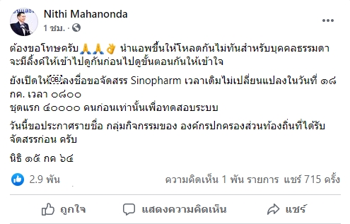 “ต้องขอโทษครับ นำแอพพ์ขึ้นให้โหลดกันไม่ทันสำหรับบุคคลธรรมดา จะมีลิงค์ให้เข้าไปดูกันก่อนไปดูขั้นตอนกันให้เข้าใจ ยังเปิดให้ลงชื่อขอจัดสรร Sinopharm เวลาเดิมไม่เปลี่ยนแปลงในวันที่ 18 ก.ค. เวลา 08.00 น. ชุดแรก 40,000 คนก่อนเท่านั้นเพื่อทดสอบระบบ วันนี้ขอประกาศรายชื่อ กลุ่มกิจกรรมขององค์กรปกครองส่วนท้องถิ่นที่ได้รับจัดสรรก่อน”