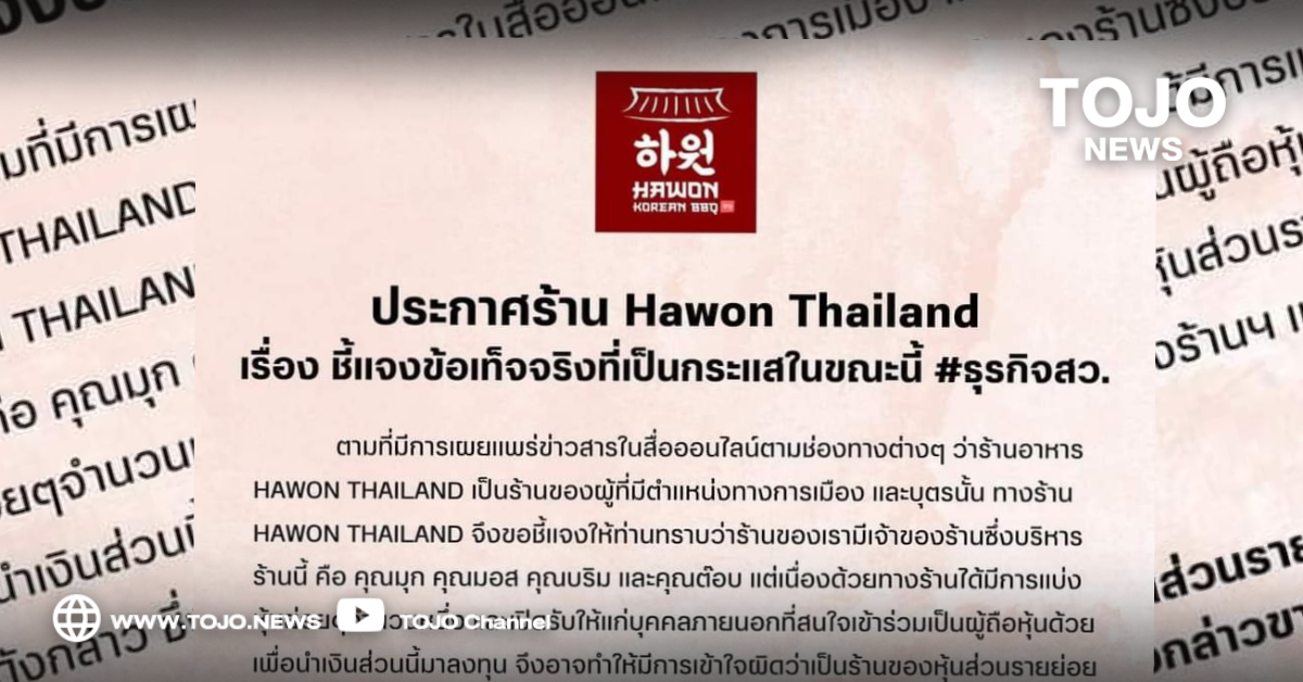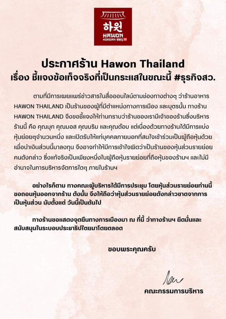 ผู้สื่อข่าวโตโจ้นิวส์รายงานว่า เพจ Hawon Thailand–ฮาวอน ร้านปิ้งย่างเกาหลีชื่อดัง ย่านเหม่งจ๋าย ออกประกาศหลังแฮซแท็ก ธุรกิจสว ที่ประชาชนเปิดวาร์ปกิจการลูกหลาน ส.ว. ที่โหวต “งดออกเสียง” นายพิธา ลิ้มเจริญรัตน์ ในการลงมติเลือกนายกฯ โดยพบว่า มีลูกชาย ส.ว. รายหนึ่งหุ้นทำธุรกิจร้านอาหารเกาหลี