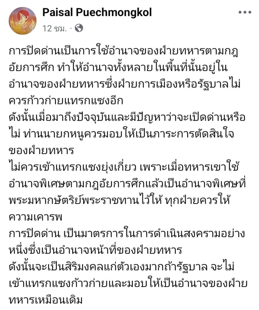ไพศาล ชี้ การปิดด่านเป็นการใช้อำนาจของฝ่ายทหารตามกฎอัยการศึก ฝ่ายการเมืองไม่ควรก้าวก่ายแทรกแซง
