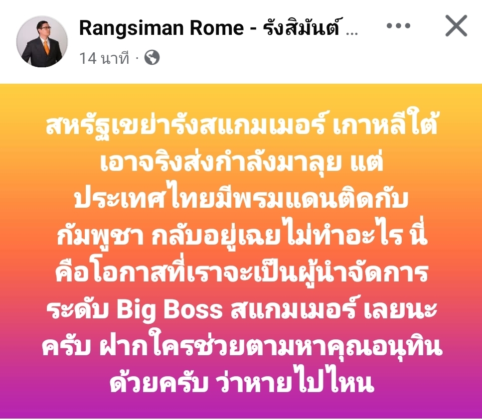 สหรัฐเขย่ารังสแกมเมอร์ เกาหลีใต้เอาจริงส่งกำลังมาลุย แต่ประเทศไทยมีพรมแดนติดกับกัมพูชา กลับอยู่เฉยไม่ทำอะไร นี่คือโอกาสที่เราจะเป็นผู้นำจัดการระดับ Big Boss สแกมเมอร์ เลยนะครับ ฝากใครช่วยตามหาคุณอนุทินด้วยครับ ว่าหายไปไหน