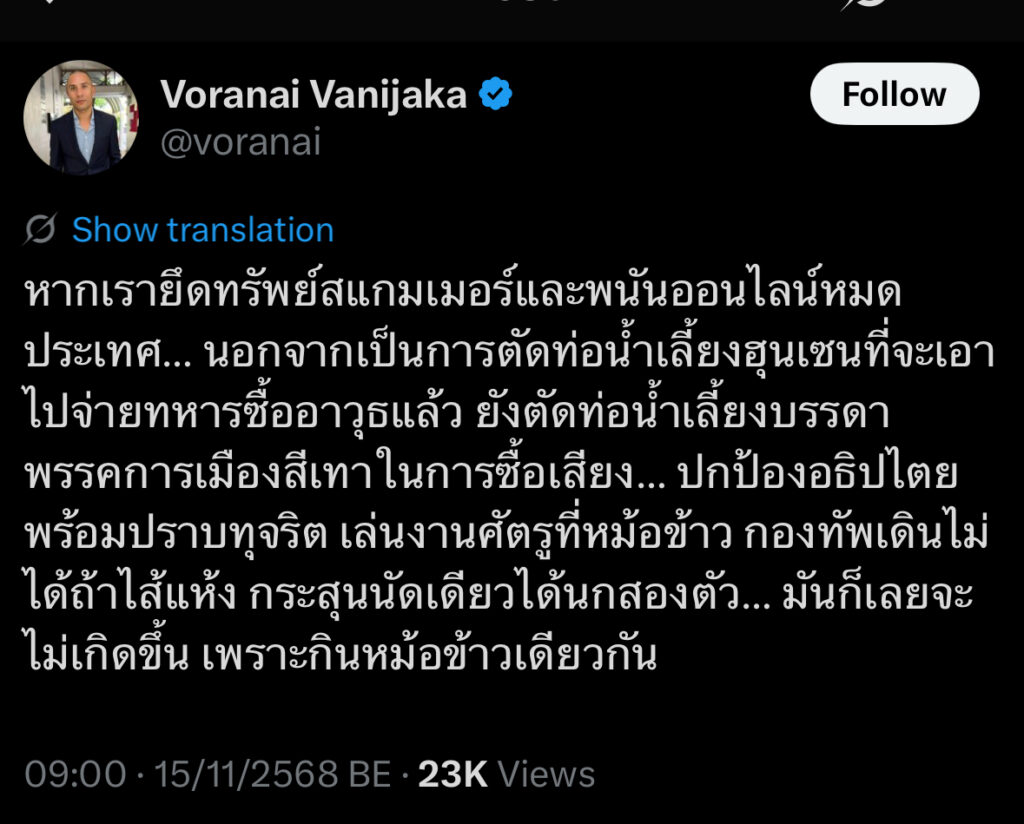 หากเรายึดทรัพย์สแกมเมอร์และพนันออนไลน์หมดประเทศ… นอกจากเป็นการตัดท่อนํ้าเลี้ยงฮุนเซนที่จะเอาไปจ่ายทหารซื้ออาวุธแล้ว ยังตัดท่อนํ้าเลี้ยงบรรดาพรรคการเมืองสีเทาในการซื้อเสียง… ปกป้องอธิปไตยพร้อมปราบทุจริต เล่นงานศัตรูที่หม้อข้าว กองทัพเดินไม่ได้ถ้าไส้แห้ง กระสุนนัดเดียวได้นกสองตัว… มันก็เลยจะไม่เกิดขึ้น เพราะกินหม้อข้าวเดียวกัน