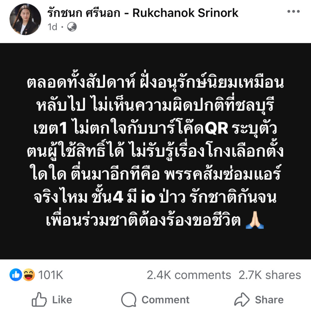 ตลอดทั้งสัปดาห์ ฝั่งอนุรักษ์นิยมเหมือนหลับไป ไม่เห็นความผิดปกติที่ชลบุรีเขต1 ไม่ตกใจกับบาร์โค๊ดQR ระบุตัวตนผู้ใช้สิทธิ์ได้ ไม่รับรู้เรื่องโกงเลือกตั้งใดใด ตื่นมาอีกทีคือ พรรคส้มซ่อมแอร์จริงไหม ชั้น4 มี io ป่าว รักชาติกันจนเพื่อนร่วมชาติต้องร้องขอชีวิต 🙏🏻