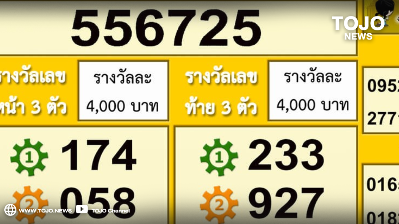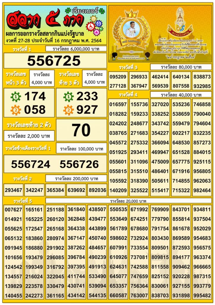 ผู้สื่อข่าวโตโจ้นิวส์รายงานว่า เพจสลาก 5 ภาค ทำสรุปผลการออกรางวัลสลากกินแบ่งรัฐบาลประจำงวดวันที่ 16 ก.ค.64 ดังนี้