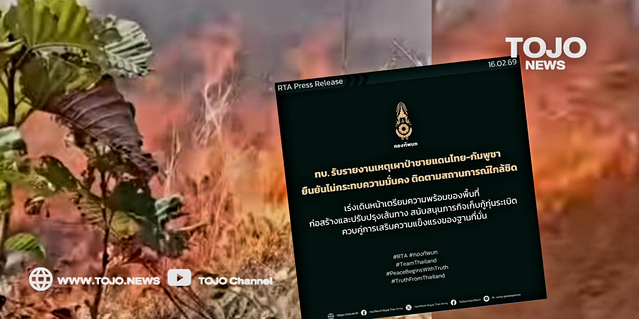 ผู้สื่อข่าวโตโจ้นิวส์รายงานว่า พลตรี วินธัย สุวารี โฆษกกองทัพบก เปิดเผยว่า กองทัพบกได้รับรายงานจากหน่วยในพื้นที่ถึงกรณีพบการเผาป่าบริเวณชายแดนไทย–กัมพูชา ในบริเวณฝั่งกัมพูชาตรงข้ามกับพื้นที่ช่องบก พื้นที่พระวิหาร และพื้นที่ช่องคนา