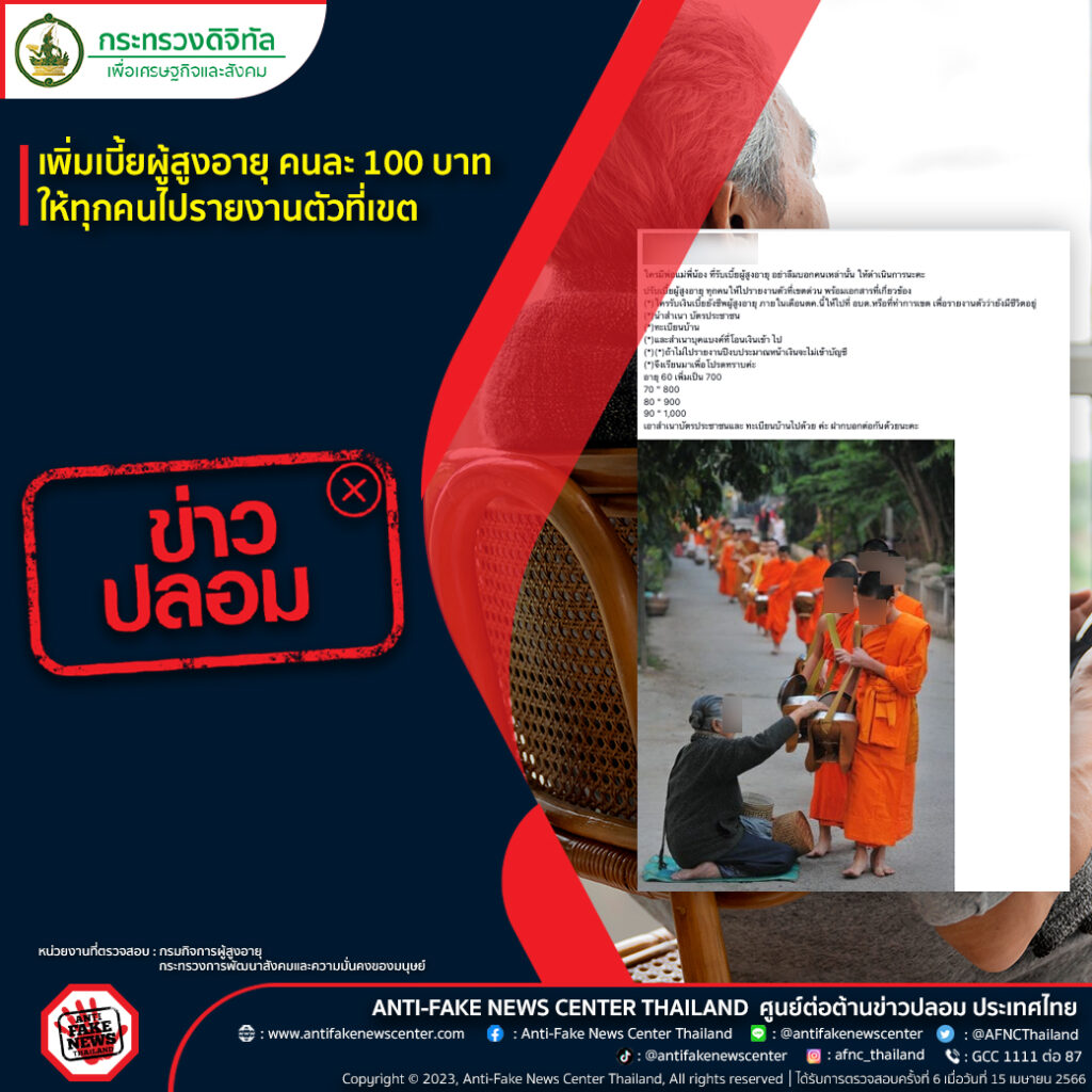 แชร์ในเน็ต เพิ่มเบี้ยผู้สูงอายุ คนละ 100 บาท ให้ทุกคนไปรายงานตัวที่เขต เป็นข้อมูลเท็จ