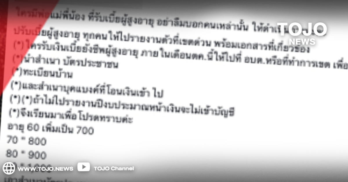 ผู้สื่อข่าวโตโจ้นิวส์รายงานว่า ตามที่มีการโพสต์และแชร์ข้อความในสื่อต่าง ๆ เกี่ยวกับประเด็นเรื่องเพิ่มเบี้ยผู้สูงอายุ คนละ 100 บาท ให้ทุกคนไปรายงานตัวที่เขต ทางศูนย์ต่อต้านข่าวปลอมได้ดำเนินการตรวจสอบข้อเท็จจริงโดยกรมกิจการผู้สูงอายุ กระทรวงการพัฒนาสังคมและความมั่นคงของมนุษย์ พบว่าประเด็นดังกล่าวนั้น เป็นข้อมูลเท็จ