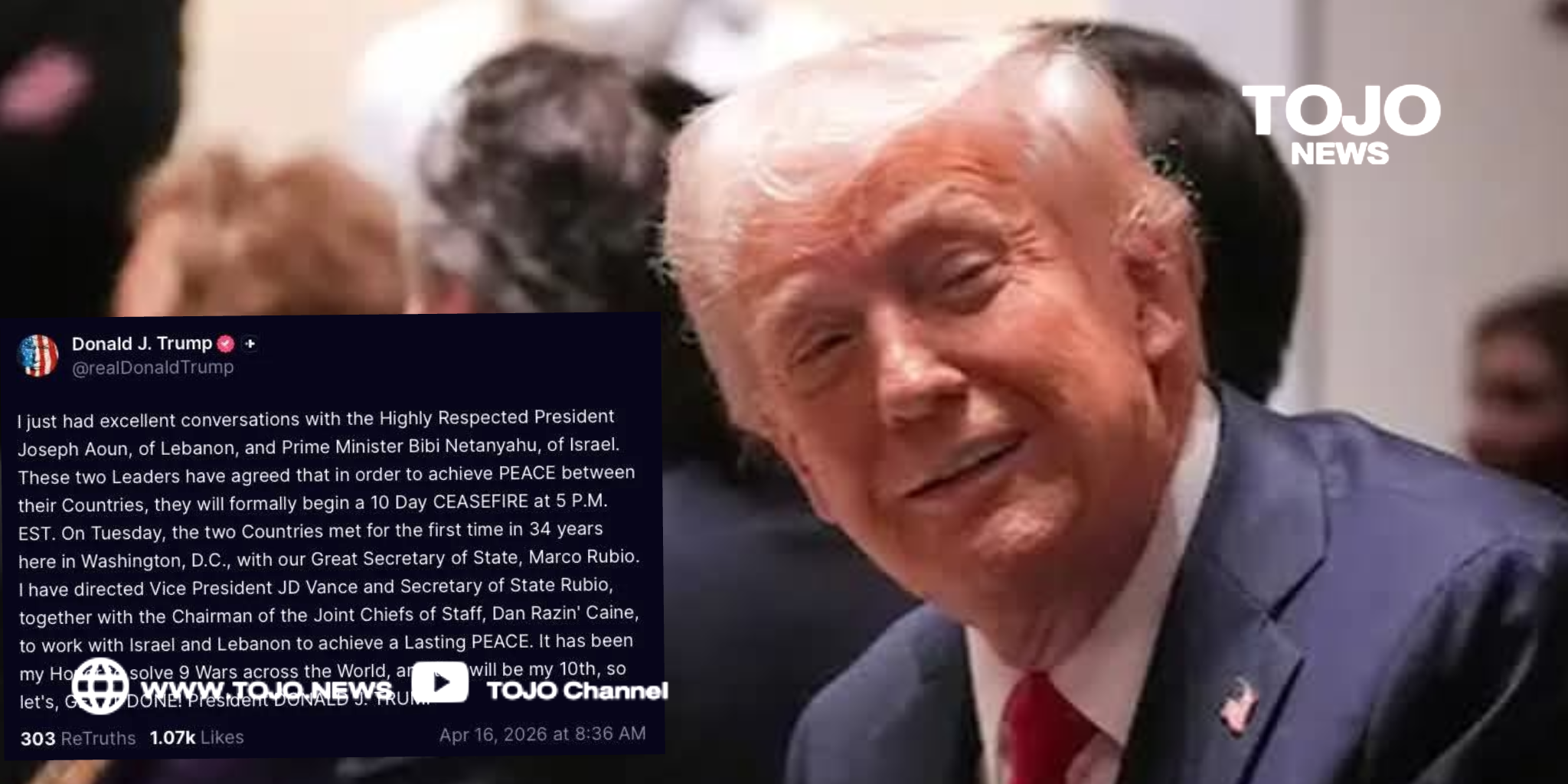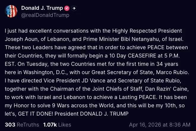“ผมเพิ่งมีการสนทนาที่ยอดเยี่ยมกับประธานาธิบดีโจเซฟ อูน (Joseph Aoun) แห่งเลบานอน และนายกรัฐมนตรีบีบี เนทันยาฮู (Bibi Netanyahu) แห่งอิสราเอล