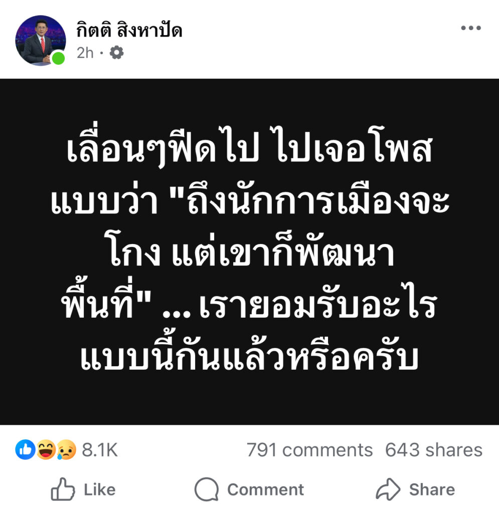 เลื่อนๆฟีดไป ไปเจอโพสแบบว่า “ถึงนักการเมืองจะโกง แต่เขาก็พัฒนาพื้นที่” … เรายอมรับอะไรแบบนี้กันแล้วหรือครับ