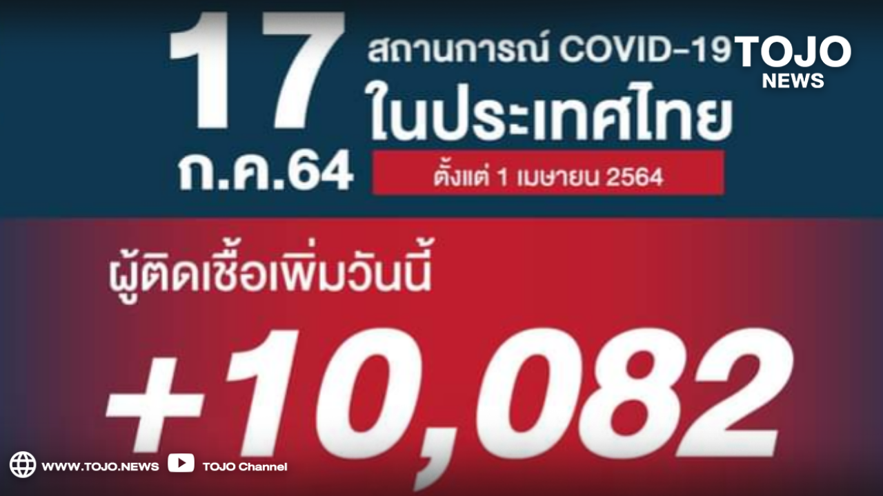 ผู้สื่อข่าวโตโจ้นิวส์รายงานว่า ศบค.สรุปยอดผู้ติดเชื้อโควิด-19 ประจำวัน วันเสาร์ที่ 17 กรกฎาคม 2564 รวม 10,082 ราย จำแนกเป็น