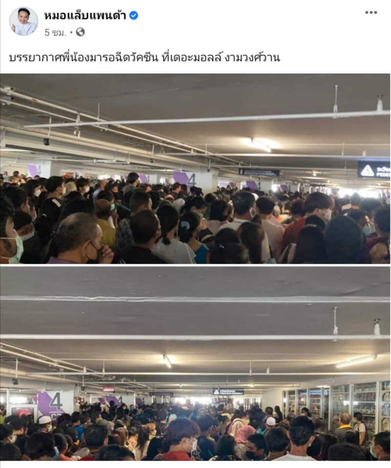 ผู้สื่อข่าวโตโจ้นิวส์รายงานว่า วันที่ 17 ก.ค.64 จากกรณีหมอแล็บแพนด้า รวมทั้งประชาชนมีการแชร์ภาพคนรอฉีดวัคซีนที่ห้างแห่งหนึ่งย่านงามวงศ์วานยืนแออัดยัดเยียดจำนวนมากนั้น ล่าสุด สำนักงานสาธารณสุขจังหวัด(สสจ.)นนทบุรี ได้ชี้แจง ผ่านเพจ โดยระบุว่า ตามที่ได้ปรากฎเป็นข่าวว่าการฉีดวัคซีนที่ศูนย์ฉีดเดอะมอลล์ งามวงศ์วาน มีประชาชนมารวมกันจำนวน มาก มีข้อเท็จจริง คือ