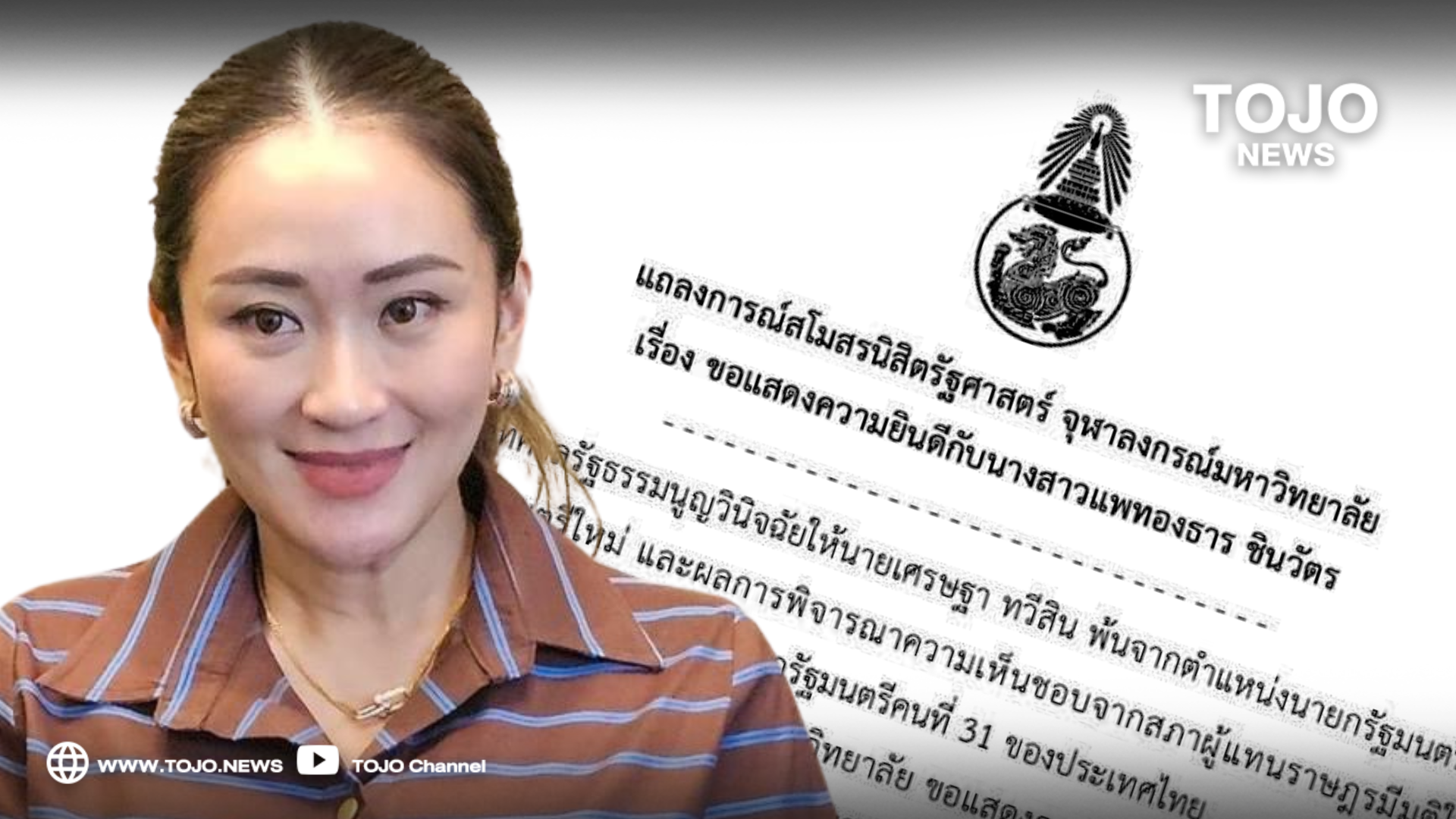 ผู้สื่อข่าวโตโจ้นิวส์รายงานว่า สโมสรนิสิตรัฐศาสตร์ จุฬาลงกรณ์มหาวิทยาลัย ออกมาแถลงการณ์ แสดงความยินดีกับนางสาวแพทองธาร ชินวัตร โดยระบุว่า