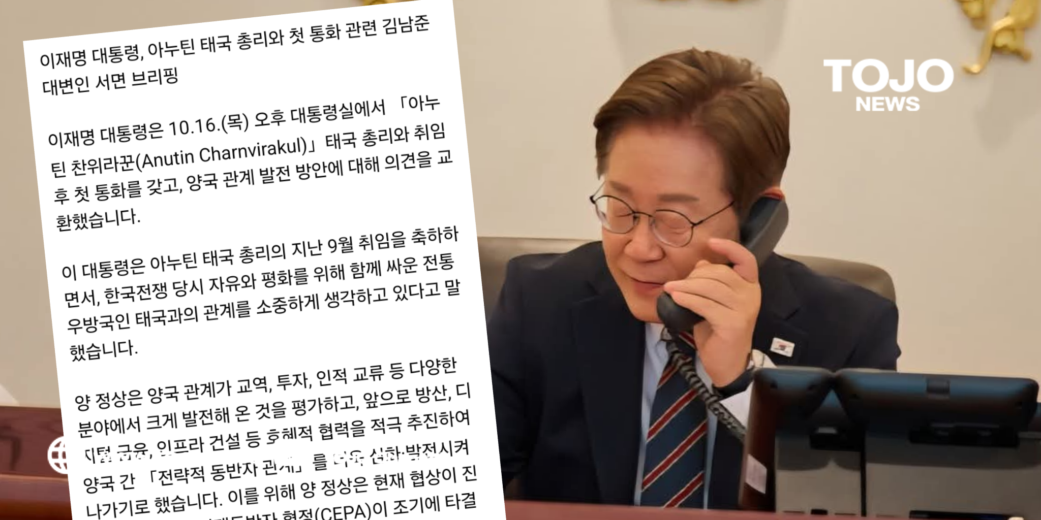 ในช่วงบ่ายของวันพฤหัสบดีที่ 16 ตุลาคม ประธานาธิบดี ลีแจมย็อง ได้สนทนาทางโทรศัพท์กับ นายกรัฐมนตรี อนุทิน ชาญวีรกูล แห่งราชอาณาจักรไทยซึ่งเป็นครั้งแรกหลัง ประธานาธิบดี ลี เข้ารับตำแหน่ง ทั้งสองฝ่ายได้แลกเปลี่ยนความคิดเห็นเกี่ยวกับแนวทางการพัฒนาความสัมพันธ์ระหว่างสองประเทศ