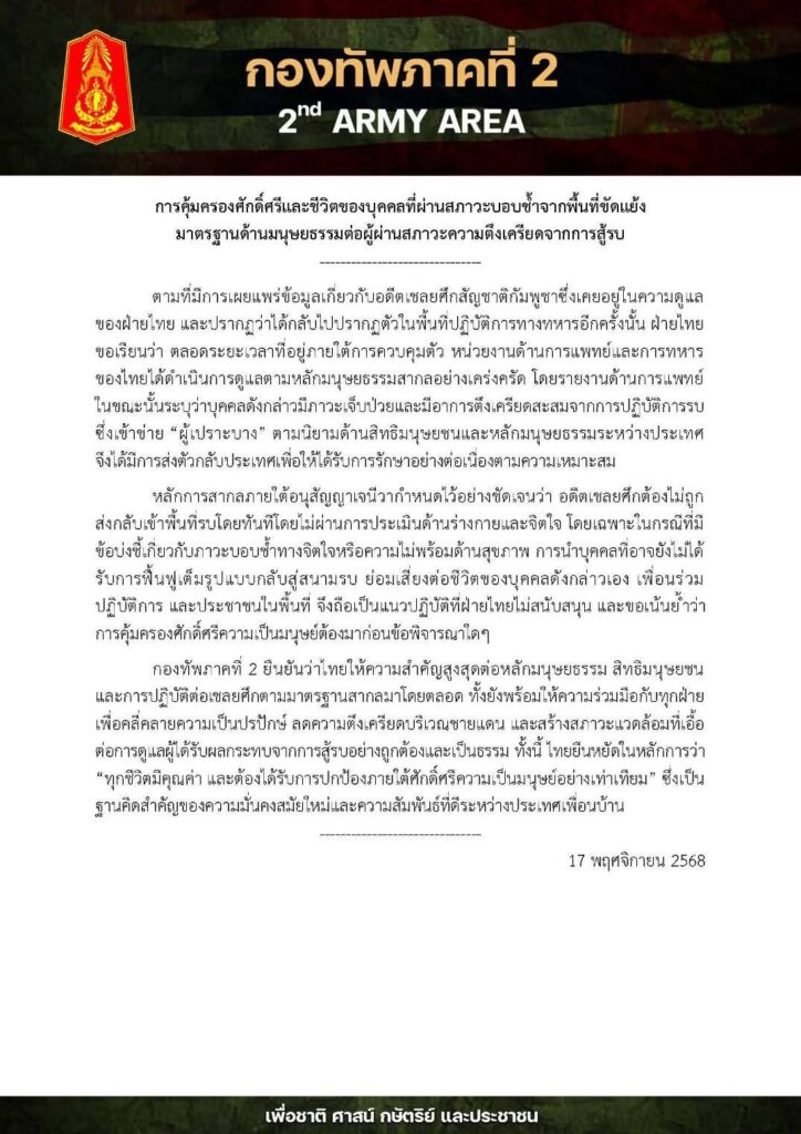กองทัพภาคที่ 2 ยืนยันว่าไทยให้ความสำคัญสูงสุดต่อหลักมนุษยธรรม สิทธิมนุษยชน และการปฏิบัติต่อเชลยศึกตามมาตรฐานสากลมาโดยตลอด ทั้งยังพร้อมให้ความร่วมมือกับทุกฝ่ายเพื่อคลี่คลายความเป็นปรปักษ์ ลดความตึงเครียดบริเวณชายแดน และสร้างสภาวะแวดล้อมที่เอื้อต่อการดูแลผู้ได้รับผลกระทบจากการสู้รบอย่างถูกต้องและเป็นธรรม