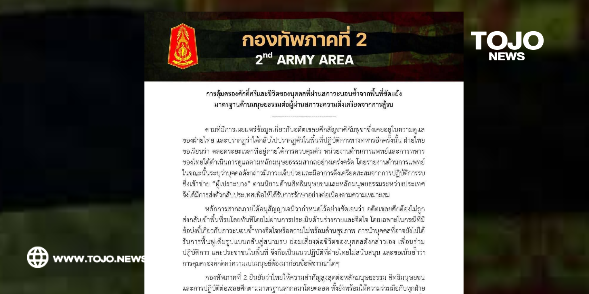 กองทัพภาคที่ 2 แถลง การคุ้มครองศักดิ์ศรีและชีวิตของบุคคลที่ผ่านสภาวะบอบช้ำจากพื้นที่ขัดแย้ง มาตรฐานด้านมนุษยธรรมต่อผู้ผ่านสภาวะความตึงเครียดจากการสู้รบ