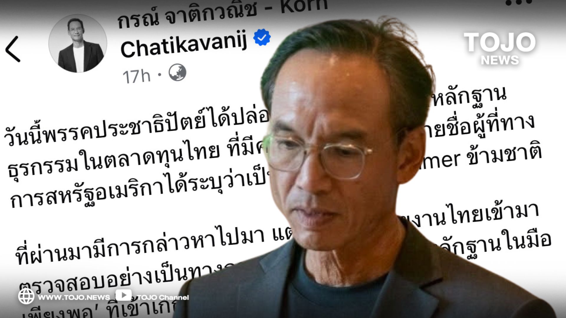 ผู้สื่อข่าวโตโจ้นิวส์รายงานว่า นายกรณ์ จาติกวณิช รองหัวหน้าพรรคประชาธิปัตย์ โพสต์ข้อความผ่านเฟซบุ๊ก ระบุว่า