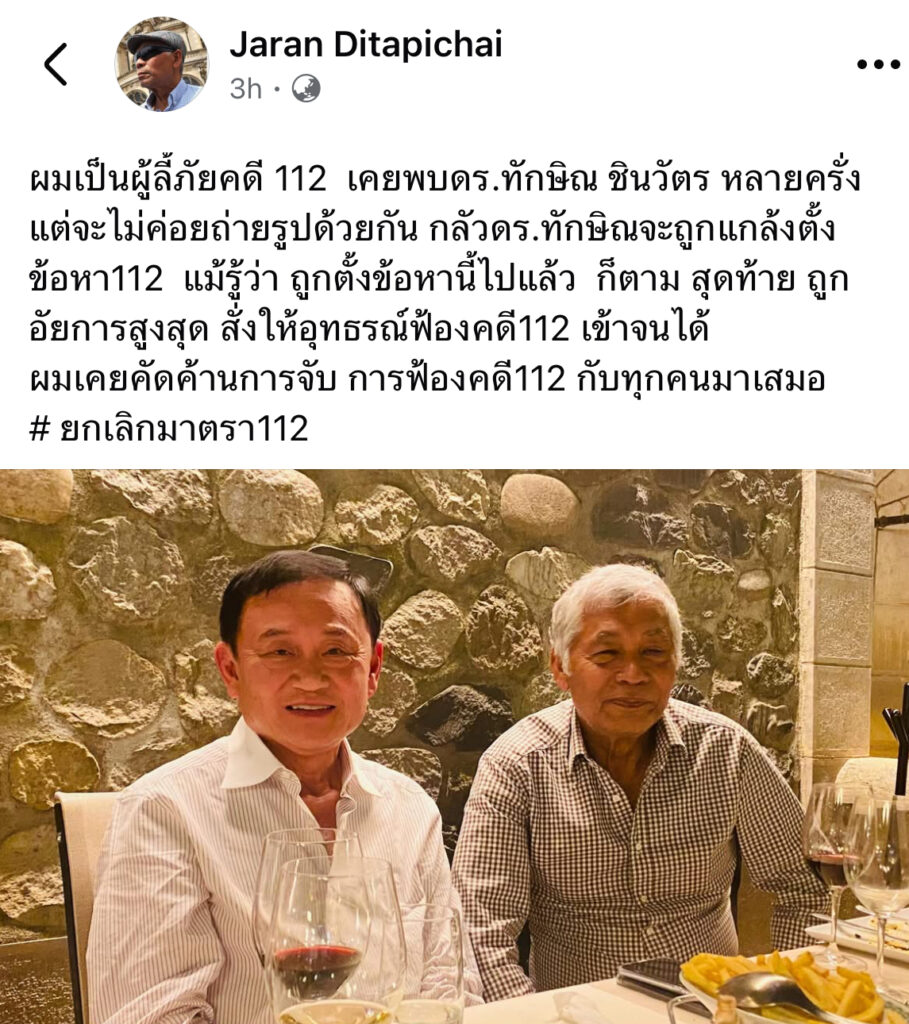 ผมเป็นผู้ลี้ภัยคดี 112 เคยพบดร.ทักษิณ ชินวัตร หลายครั่ง แต่จะไม่ค่อยถ่ายรูปด้วยกัน กลัวดร.ทักษิณจะถูกแกล้งตั้งข้อหา112 แม้รู้ว่า ถูกตั้งข้อหานี้ไปแล้ว ก็ตาม สุดท้าย ถูกอัยการสูงสุด สั่งให้อุทธรณ์ฟ้องคดี112 เข้าจนได้