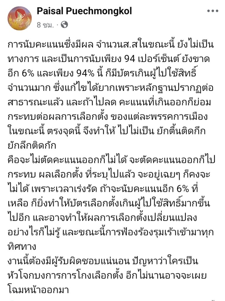 ไพศาล ตั้งข้อสงสัย?? ถ้าจะนับคะแนนอีก 6% ที่เหลือ ก็ยิ่งทำให้บัตรเลือกตั้งเกินผู้ไปใช้สิทธิ์มากขึ้นไปอีก?
