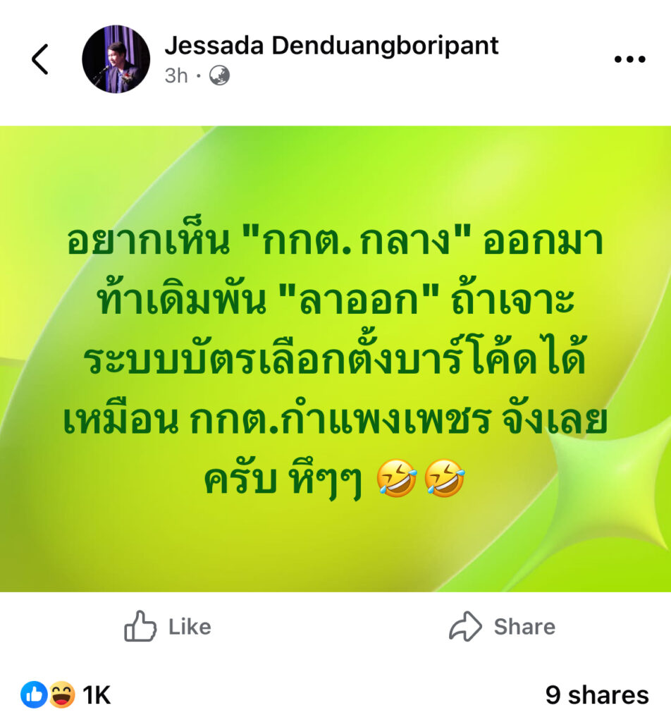 อยากเห็น “กกต. กลาง” ออกมาท้าเดิมพัน “ลาออก” ถ้าเจาะระบบบัตรเลือกตั้งบาร์โค้ดได้ เหมือน กกต.กำแพงเพชร จังเลยครับ หึๆๆ