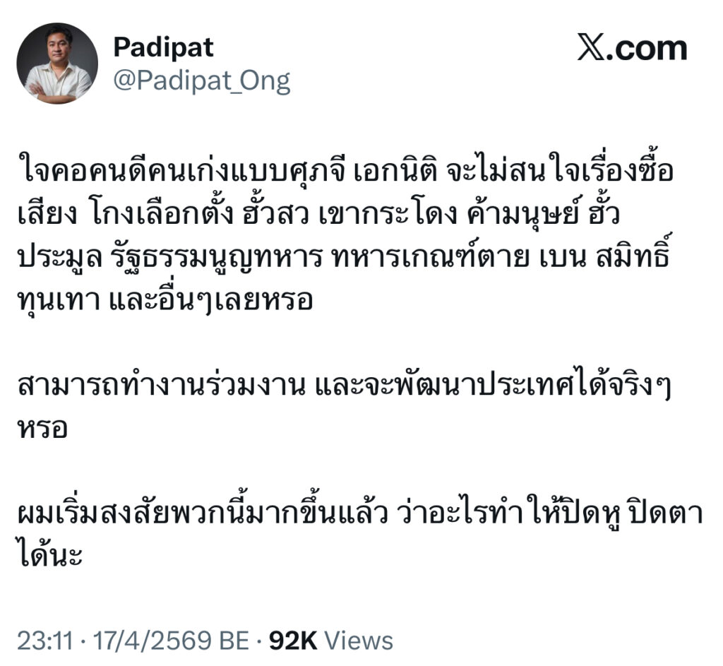 ใจคอคนดีคนเก่งแบบศุภจี เอกนิติ จะไม่สนใจเรื่องซื้อเสียง โกงเลือกตั้ง ฮั้วสว เขากระโดง ค้ามนุษย์ ฮั้วประมูล รัฐธรรมนูญทหาร ทหารเกณฑ์ตาย เบน สมิทธิ์ ทุนเทา และอื่นๆเลยหรอ
