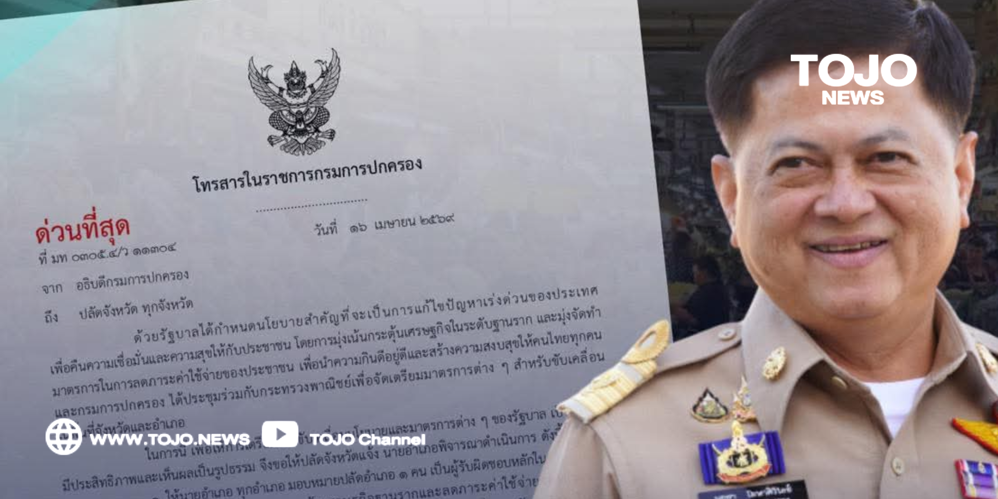 ผู้สื่อข่าวโตโจ้นิวส์รายงานว่า นายนฤชา โฆษาศิวิไลซ์ อธิบดีกรมการปกครอง มีโทรสารในราชการกรมการปกครอง ด่วนที่สุด ที่ มท 0305.4/ว 11304 ลงวันที่ 16 เมษายน 2569 ถึงปลัดจังหวัดทั่วประเทศ สืบเนื่องรัฐบาลได้กำหนดนโยบายเร่งด่วนเพื่อคืนความเชื่อมั่น และยกระดับความเป็นอยู่ของประชาชน โดยมุ่งกระตุ้นเศรษฐกิจฐานรากควบคู่ลดภาระค่าครองชีพ เพื่อสร้างความกินดีอยู่ดีและความสงบสุขให้คนไทยทุกคน