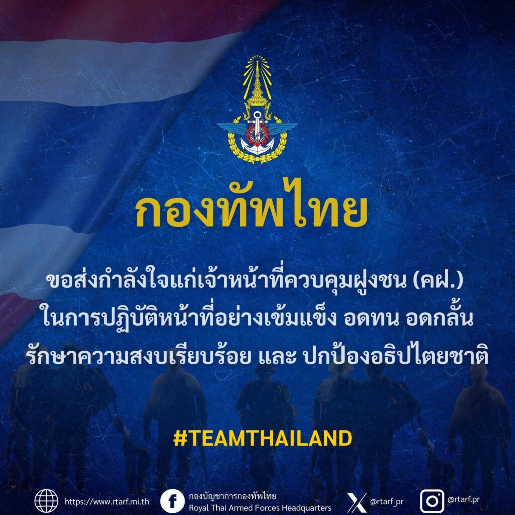 กองทัพไทยขอส่งกำลังใจแก่เจ้าหน้าที่ควบคุมฝูงชน (คฝ.) ทุกนาย ณ บ้านหนองหญ้าแก้ว อำเภอโคกสูง จังหวัดสระแก้ว ที่ได้ปฏิบัติหน้าที่ด้วยความเข้มแข็ง อดทน และอดกลั้น ภายใต้มาตรการควบคุมสถานการณ์อย่างมีสติและเป็นขั้นตอน เพื่อรักษาความสงบเรียบร้อย และปกป้องอธิปไตยของชาติ
