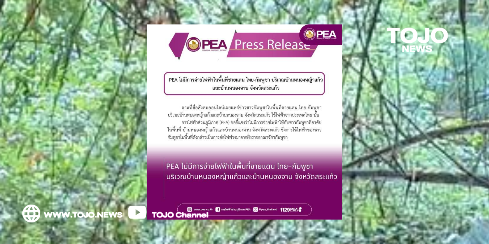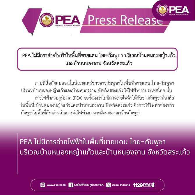 การไฟฟ้าส่วนภูมิภาค (PEA) ขอชี้แจงว่าไม่มีการจ่ายไฟฟ้าให้กับชาวกัมพูชาที่อาศัยในพื้นที่ บ้านหนองหญ้าแก้วและบ้านหนองจาน จังหวัดสระแก้ว ซึ่งการใช้ไฟฟ้าของชาวกัมพูชาในพื้นที่ดังกล่าวเป็นการต่อไฟพ่วงมาจากฝั่งราชอาณาจักรกัมพูชา