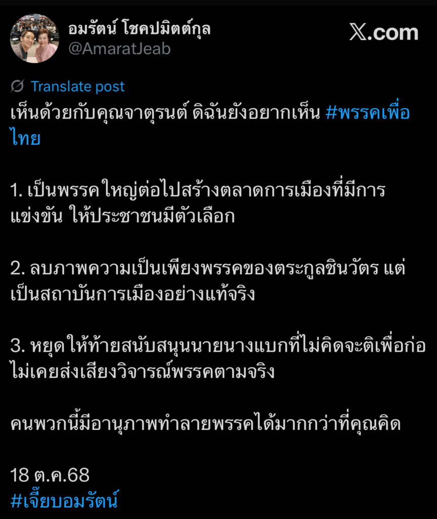 ล่าสุด นางอมรัตน์ โชคปมิตต์กุล อดีต สส.พรรคก้าวไกล โพสต์ข้อความผ่านเอ็กซ์ โดยระบุว่า