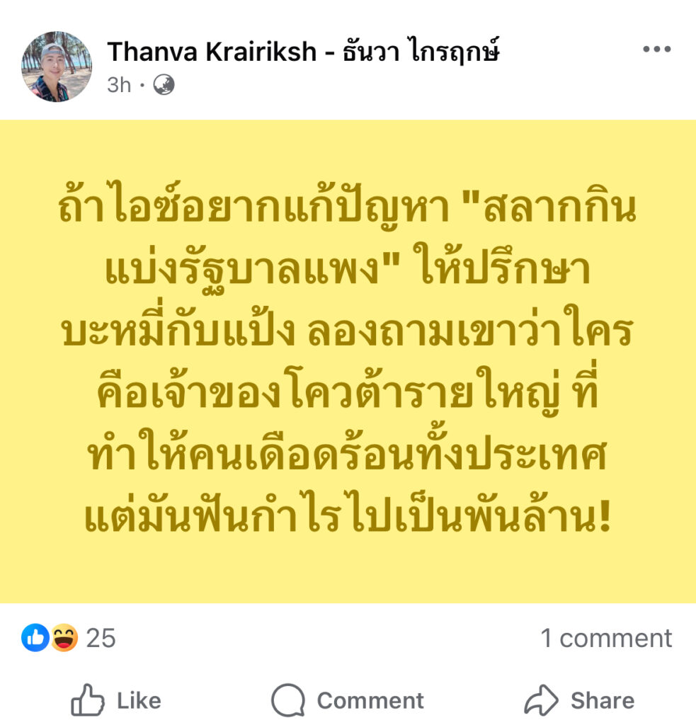 ธันวา แนะ ไอซ์ รักชนก ถ้าอยากแก้ปัญหาสลากินแบ่งรัฐบาลแพง ให้ปรึกษาบะหมี่กับแป้ง