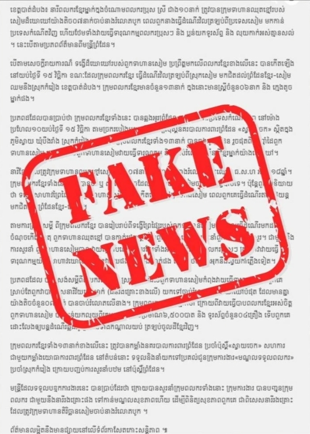 โดยจากการตรวจสอบข้อมูลในพื้นที่อย่างละเอียดไม่พบเหตุการณ์ตามที่ถูกกล่าวหา และไม่มีหน่วยทหารไทยหน่วยใดมีพฤติกรรมตามที่สื่อกัมพูชาเผยแพร่ การกล่าวหาครั้งนี้อาจมีเป้าหมายสร้างความเข้าใจผิด สร้างความเกลียดชังและบ่อนทำลายความสัมพันธ์ชายแดนไทย–กัมพูชา