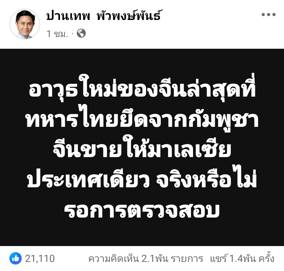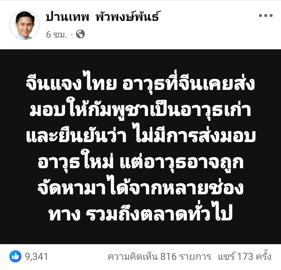 โดยนายปานเทพ ยังโพสต์ ด้วยว่า… จีนแจงไทย อาวุธที่จีนเคยส่งมอบให้กัมพูชาเป็นอาวุธเก่า และยืนยันว่า ไม่มีการส่งมอบอาวุธใหม่ แต่อาวุธอาจถูกจัดหามาได้จากหลายช่องทาง รวมถึงตลาดทั่วไป