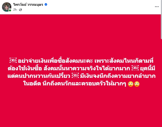 ไพรวัลย์ เตือนสติ อย่าจ่ายเงินเพื่อซื้อสังคม ถ้าต้องซื้อ… แปลว่าสังคมนั้นหาความจริงใจไม่ได้