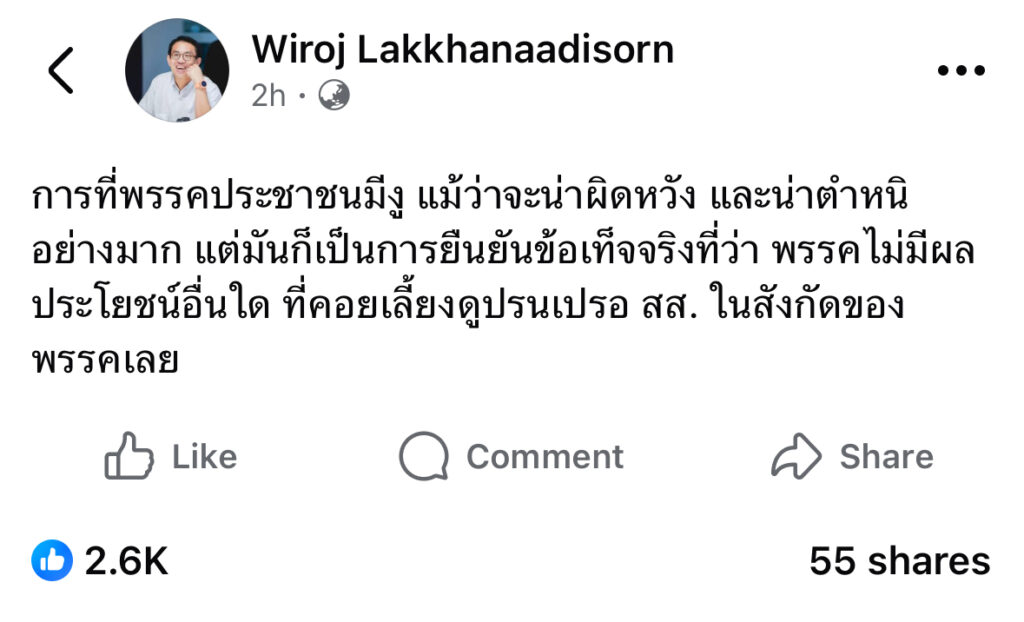 ผู้สื่อข่าวโตโจ้นิวส์รายงานว่า นายวิโรจน์ ลักขณาอดิศร อดีต สส. บัญชีรายชื่อ พรรคประชาชน โพสต์ข้อความผ่านเฟซบุ๊ก ระบุว่า