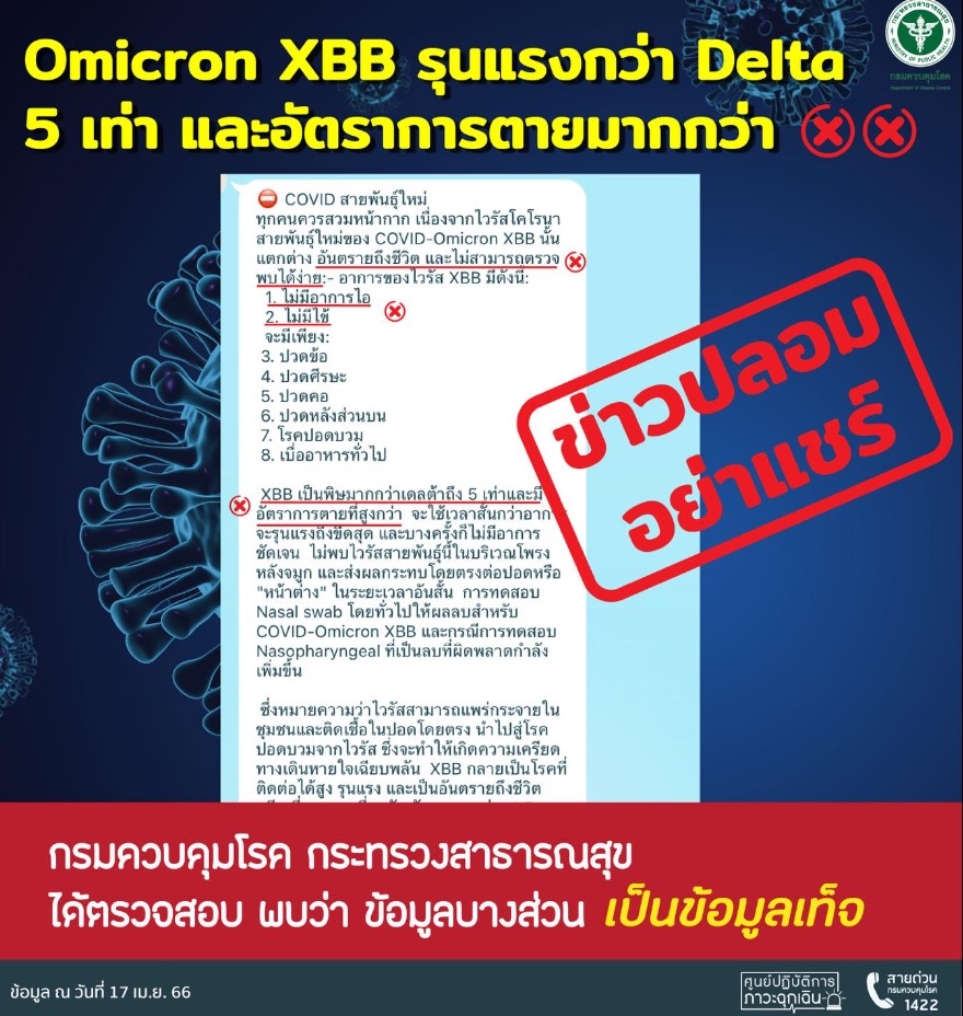 กรมควบคุมโรค เตือนประชาชน! ข่าวปลอมว่อนโซเชียล โอมิครอน XBB รุนแรงกว่าเดลต้า 5 เท่า
