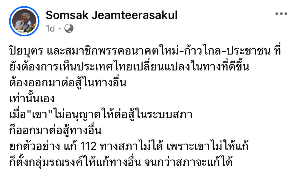 สมศักดิ์ เจียม แนะ จนกว่าสภาฯ จะให้แก้ ม.112 ปิยบุตร และสมาชิกคนอื่น ต้องหาทางต่อสู้