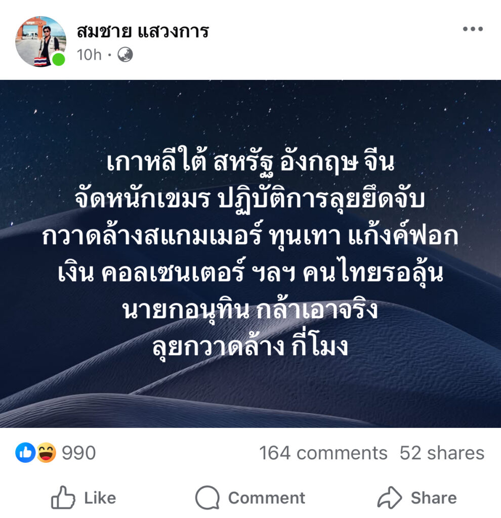 สมชาย ลั่น คนไทยรอลุ้น อนุทินกล้าเอาจริงเรื่องสแกมเมอร์กี่โมง