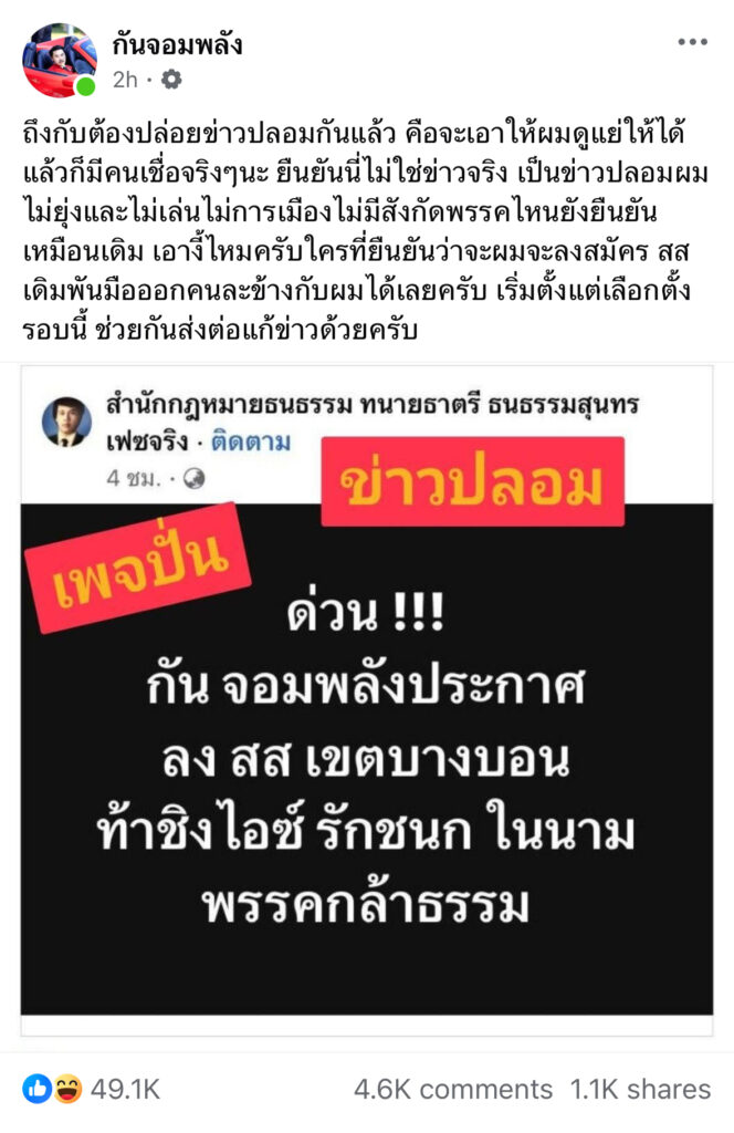 ถึงกับต้องปล่อยข่าวปลอมกันแล้ว คือจะเอาให้ผมดูแย่ให้ได้แล้วก็มีคนเชื่อจริงๆนะ ยืนยันนี่ไม่ใช่ข่าวจริง เป็นข่าวปลอมผมไม่ยุ่งและไม่เล่นไม่การเมืองไม่มีสังกัดพรรคไหนยังยืนยันเหมือนเดิม เอางี้ไหมครับใครที่ยืนยันว่าจะผมจะลงสมัคร สส เดิมพันมือออกคนละข้างกับผมได้เลยครับ เริ่มตั้งแต่เลือกตั้งรอบนี้ ช่วยกันส่งต่อแก้ข่าวด้วยครับ