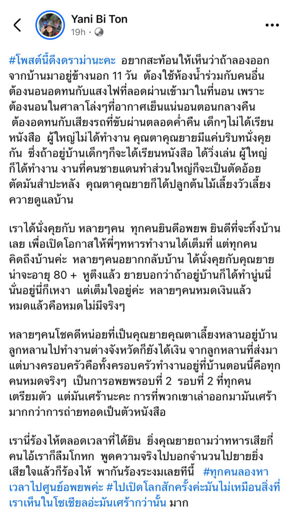 โพสต์นี้ดึงดราม่านะคะ อยากสะท้อนให้เห็นว่าถ้าลองออกจากบ้านมาอยู่ข้างนอก 11 วัน ต้องใช้ห้องน้ำร่วมกับคนอื่น ต้องนอนอดทนกับแสงไฟที่ลอดผ่านเข้ามาในที่นอน เพราะต้องนอนในศาลาโล่งๆที่อากาศเย็นแน่นอนตอนกลางคืน