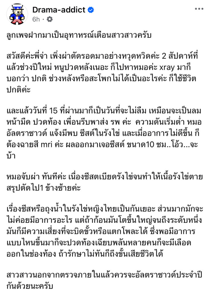 เพจดัง แชร์อุทาหรณ์ ปวดหลัง หน้ามือ ปวดท้อง ตรวจพบซีสต์ในรังไข่