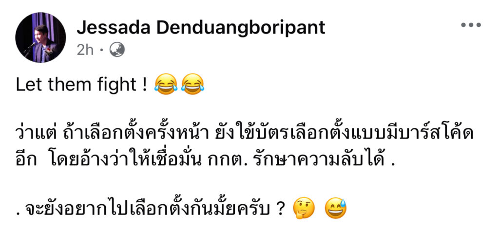 ว่าแต่ ถ้าเลือกตั้งครั้งหน้า ยังใข้บัตรเลือกตั้งแบบมีบาร์สโค้ดอีก โดยอ้างว่าให้เชื่อมั่น กกต. รักษาความลับได้
