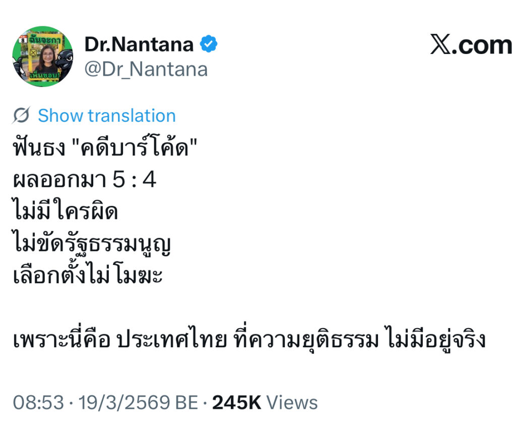 สว.นันทนา ฟันธง คดีบาร์โค้ด ไม่มีใครผิด ประเทศไทยความยุติธรรมไม่มีอยู่จริง