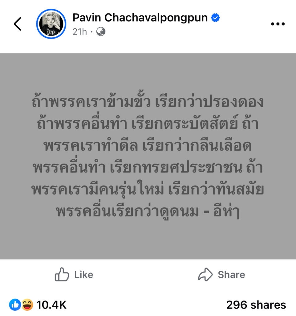 ถ้าพรรคเราข้ามขั้ว เรียกว่าปรองดอง ถ้าพรรคอื่นทำ เรียกตระบัตสัตย์ ถ้าพรรคเราทำดีล เรียกว่ากลืนเลือด พรรคอื่นทำ เรียกทรยศประชาชน ถ้าพรรคเรามีคนรุ่นใหม่ เรียกว่าทันสมัย พรรคอื่นเรียกว่าดูดนม – อีห่ๅ