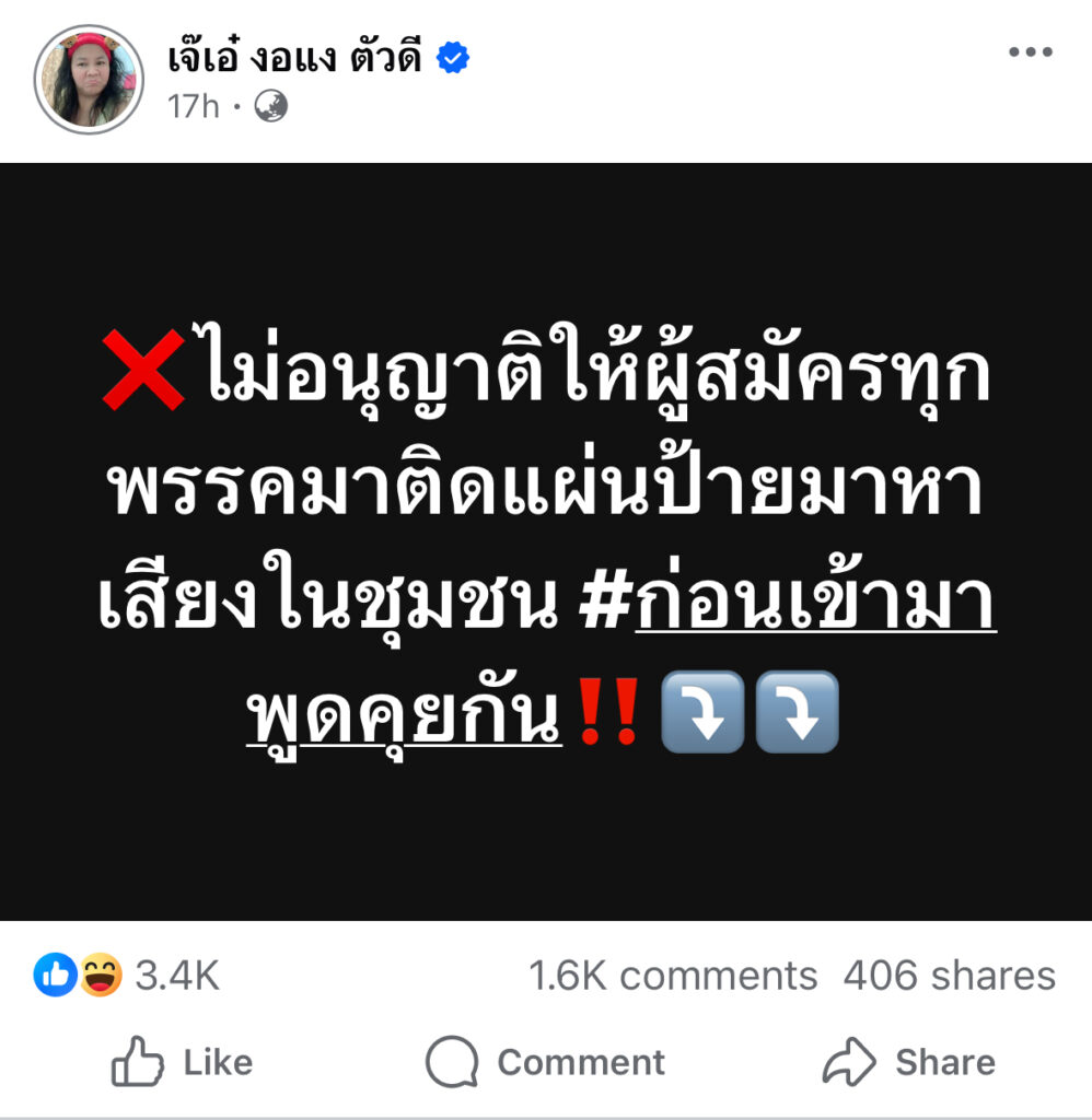 เจ๊เอ๋ ประกาศ ไม่อนุญาติให้ผู้สมัครทุกพรรคติดแผ่นป้ายมาหาเสียงในชุมชน